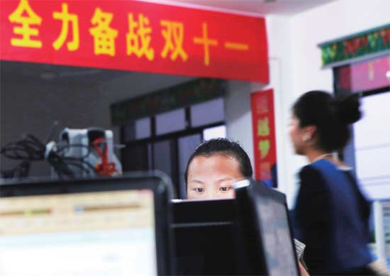 2013年10月25日,浙江北山村,吕振鸿的北山狼淘宝店客服在为顾客答疑。