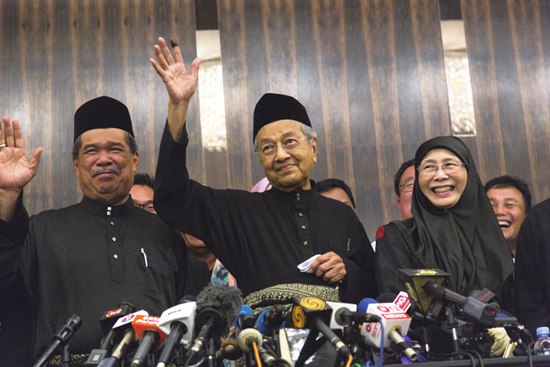 5月10日,92岁的马哈蒂尔(中)宣誓就任马来西亚总理。图片来源 CFP