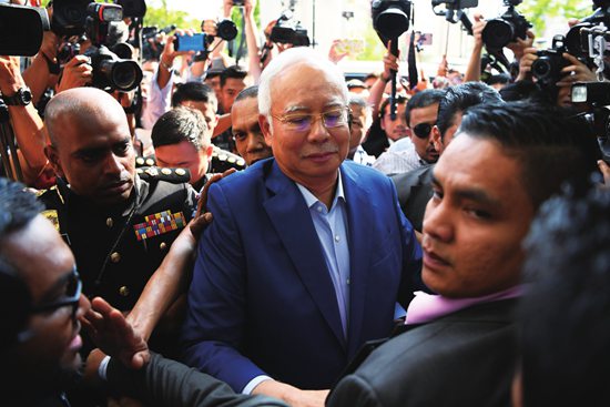 5月22日,马来西亚前总理纳吉布抵达反贪污委员会,就涉嫌贪污问题发表声明。图片来源 CFP