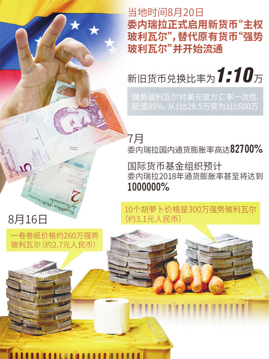 据美联社报道,加拉加斯于8月20日推行的货币改革,将该国货币对美元的官方汇率一次性贬值约95%,与黑市汇率相当。新货币“主权玻利瓦尔”将以1比10万的比率,完全替代强势玻利瓦尔。