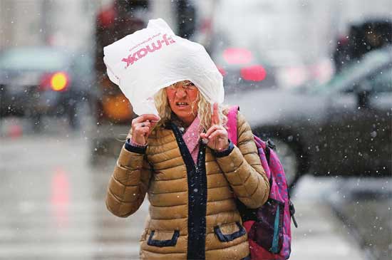 4月27日,一场在这个季节十分罕见的暴风席卷了美国芝加哥地区,市区的行人头顶塑料袋抵挡4月飞雪。