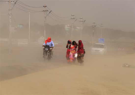 4月27日,沙尘暴袭击印度巴亚格拉吉,行人用衣物裹住头部。