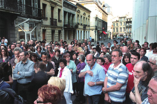 2011年4月26日,法国电信公司驻波尔多的一名员工在公司停车场自焚身亡。次日,数百人聚集在该机构门前“讨说法”。图片来源 视觉中国