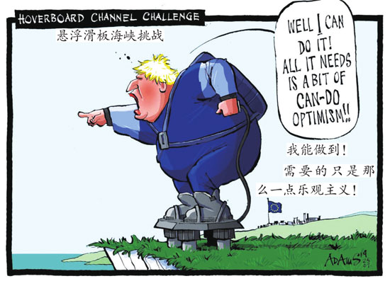 7月25日,在法国国庆日上大出风头的悬浮滑板发明者挑战飞跃英吉利海峡,结果失利落水。此前不到48小时,唐宁街10号的新主人鲍里斯·约翰逊在胜选演讲中高调宣称自己能实现英国“脱欧”,“为英国带来乐观的新精神”。