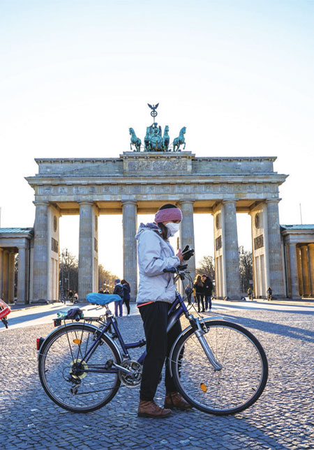 3月22日,德国柏林勃兰登堡门前,一名戴口罩的女子查看手机。当天,德国联邦政府与地方政府达成协议,将进一步限制公共生活,以遏制新冠肺炎疫情蔓延。图片来源 新华社