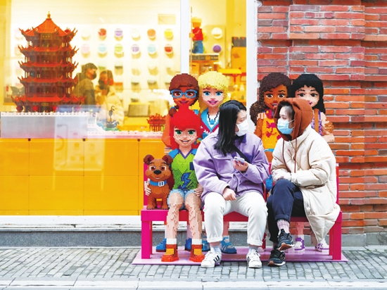 3月30日,武汉市民坐在楚河汉街乐高专卖店外聊天。江汉路、楚河汉街、光谷步行街……武汉人最爱去的这些地方不再空空荡荡,商铺大门渐次打开。武汉街头正慢慢恢复昔日的生机与活力。图片来源 新华社