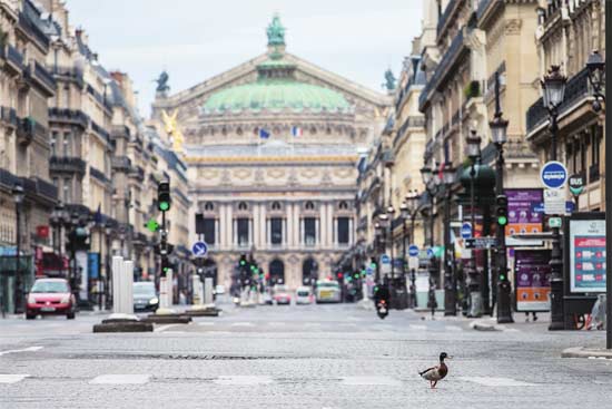 一只鸭子在巴黎歌剧院前的大道上“溜达”。法国“禁足令”实施期间,民众被要求最大限度地减少出行,不少动物“溜达”到巴黎空荡无人的大街上。
