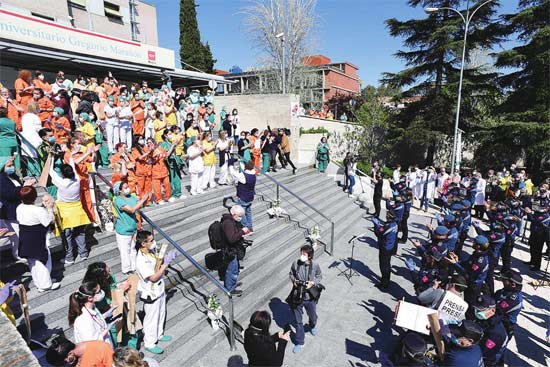 4月12日,西班牙警察在马德里一家医院外为医护人员演奏音乐,表达敬意。西班牙卫生部应急与预警协调中心11日的数据显示,该国已有2.5万名医护人员感染新冠病毒。