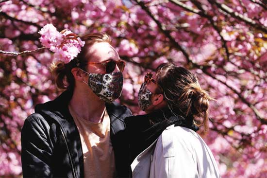 4月12日,在德国柏林,人们戴着口罩欣赏樱花。截至当天零时,德国累计新冠确诊病例为120479例,较前一日增加2821例。