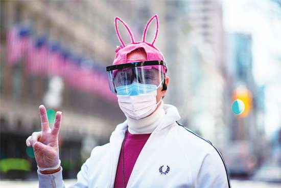 4月12日,在美国纽约圣帕特里克大教堂前,一名男子戴着兔耳帽、防护镜、口罩和手套。新冠疫情改变了西方人的“口罩观”。 图片来源 新华社