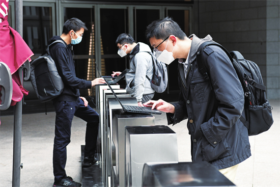 在深圳平安金融中心,员工在楼下使用笔记本电脑连接公司内网,下载安装远程办公软件,以便实现居家“云办公”。图片来源 新华社