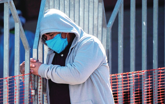 5月15日,一名男子在智利首都圣地亚哥一家医院外等待接受新冠病毒检测。图片来源 新华社