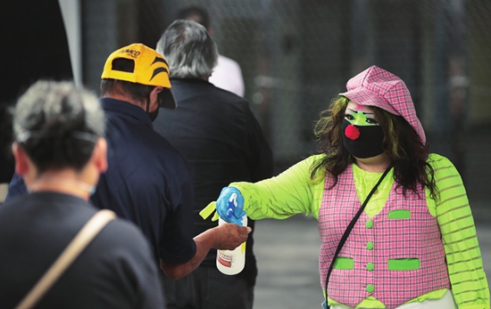 5月14日,墨西哥首都墨西哥城,一名打扮成小丑模样的女子在地铁里为乘客手部喷洒消毒液。图片来源 新华社