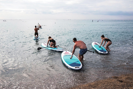 6月25日,西班牙巴塞罗那,酷暑之下,人们入海冲浪。