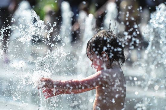 6月27日,一名儿童在俄罗斯莫斯科一处公园的喷泉内玩耍。