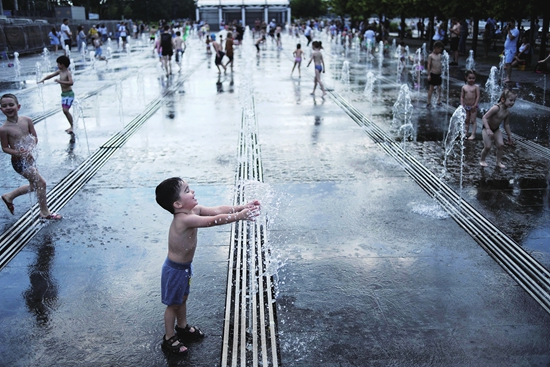 6月27日,孩子们在俄罗斯莫斯科一处公园的喷泉内玩耍。莫斯科当日迎来高温天气。