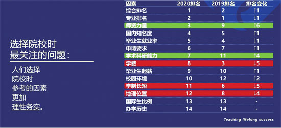 选择院校时,“师资力量”的重要性从2019年的第9位升至第3位,仅次于“综合排名”与“专业排名”,超越了“国内知名度”(排名第4位);“学术科研能力”从2019年的第11位升至第7位;“学费”“学制长短”与“地理位置”等因素分别降至第8位、第11位与第12位。由此可见,在经济和就业前景不明朗的2020年,中国学生对教育质量的重视进一步提升,以期在未来的就业市场中更具竞争力。