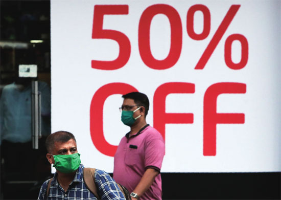 戴口罩的行人经过印度孟买一家商铺的打折广告。截至9月27日,该国累计确诊病例数逼近600万例。图片来源 新华社