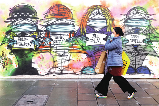 10月15日,英国伦敦,一名戴口罩的女子从涂鸦前走过。英国政府15日宣布,经过对新冠肺炎疫情形势的评估,决定把伦敦等地的疫情警戒级别从“中级”提升至“高级”,这些地区会采取更严格的防控措施。图片来源 新华社