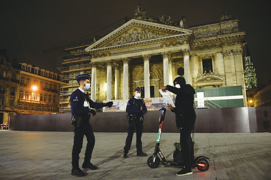 10月30日,比利时布鲁塞尔,警察检查一名男子的证件。根据比利时卫生部门10月29日公布的数据,比利时过去24小时新增新冠肺炎确诊病例21048例,创历史新高。图片来源 新华社
