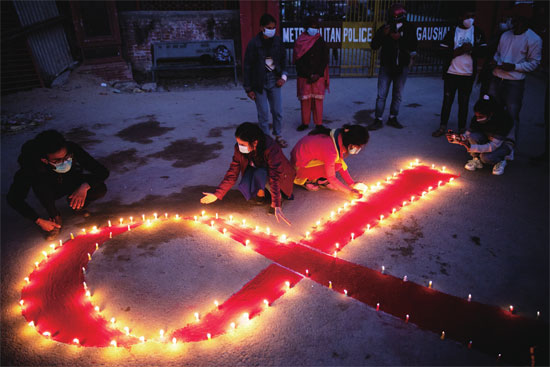 11月30日,尼泊尔加德满都,志愿者们在地上画出红丝带,并点亮周围的蜡烛。
