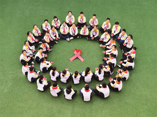 11月30日,在河北石家庄新乐市实验小学,学生们展示自己制作的红丝带。