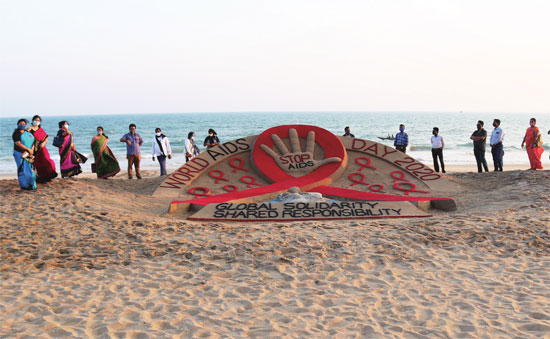 11月30日,印度布里,印度艺术家苏达尔山·帕特耐克在孟加拉湾海滩上创作“红丝带”沙雕,迎接世界艾滋病日。
