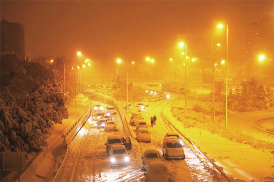 1月9日,西班牙马德里,汽车被困在雪地里。图片来源 新华社