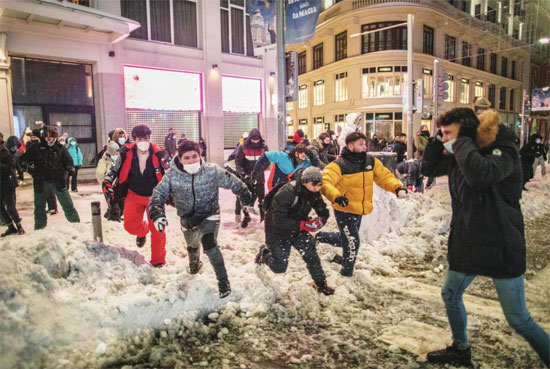 1月9日,马德里民众在街头玩雪。图片来源 视觉中国