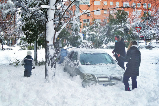 政府呼吁市民呆在家里。马德里警方封锁了屋顶积雪过厚的建筑,以防发生事故,但居民们仍成群结队地走上街头,欣赏这座城市罕见的雪景。随后,警方驱散了一场大型雪仗的参与者。天气预报警告称,接下来一周内,当地气温将降至零下25℃。