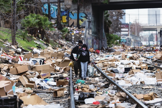 在电商时代,装满货物的火车在轨道上不分昼夜地疾驰。一旦供应链停摆,这些被迫“趴”在铁轨上的火车就成了窃贼的目标。据美国《纽约时报》报道,过去一年里,全美各地的货运枢纽频遭盗窃,西海岸首当其冲。一组在社交媒体上流传的照片显示,洛杉矶的铁轨几乎被层层叠叠的废弃纸箱埋了起来,窃贼洗劫列车后扬长而去,拾荒者们则寄希望于“拾荒”。