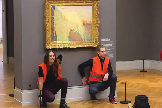 近期,破坏艺术品事件频频发生,画廊已经成为欧洲“环保人士”的热门抗议地点。10月14日,梵高名作《向日葵》被“阻止石油”组织泼了番茄酱;10月23日,德国环保组织“最后一代”瞄准了莫奈名画《干草堆》,并向其保护框上涂抹土豆泥。