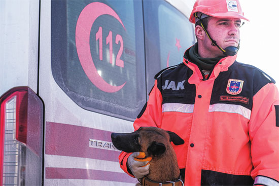 在土耳其东南部城市阿德亚曼,名叫“彼得·潘”的搜救犬正在瓦砾堆上四处嗅探,寻找幸存者。当天早些时候,当地有3名幸存者在废墟中获救。救援队收到消息说,一栋5层公寓的废墟中可能还有人活着。救援队员确认建筑残骸结构稳定后,“彼得·潘”开始工作。