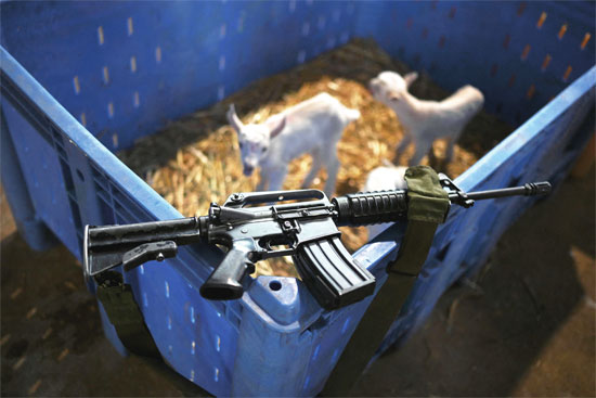 10月22日,以色列与黎巴嫩边境附近,以色列戈伦村一座农场的主人将枪支放在羊圈里。图片来源 视觉中国