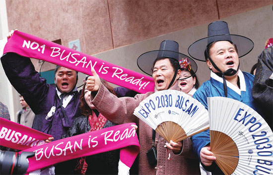 韩联社称,韩国政府与民间携手组成釜山申博委员会,奔波于世界各地,拉票行程可环绕地球495圈。11月27日,在巴黎拉票的韩国总理韩德洙告诉韩媒记者团,韩国政府和民众一心,尹锡悦嘱咐他要竭尽全力直到“终场哨声响起”。