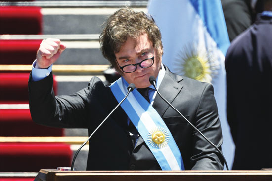 12月10日,阿根廷布宜诺斯艾利斯,总统米莱发表就职演说。上任首日,米莱将阿根廷政府的18个部砍掉了一半。图片来源 视觉中国