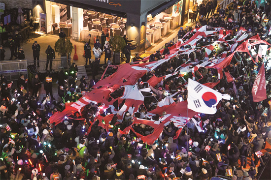 12月9日,韩国首尔,民众在执政党国民力量党总部前撕毁一幅大型标语,要求弹劾、监禁尹锡悦总统。图片来源 视觉中国