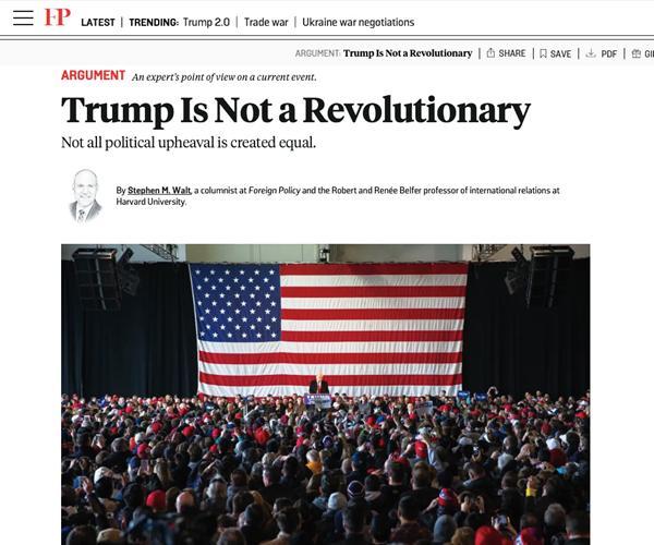 在美国政治局势震荡、保守主义思潮抬头的当下,资深国际关系学者斯蒂芬·M·沃尔特(Stephen M. Walt)于《外交政策》杂志撰文指出:特朗普及其支持者力图深度改变美国的政治和外交体制,但将他称为“革命者”是误导性的。他并非要建立新政治秩序,而是想回到理想化的旧时代,是典型的“反动领导者”。
