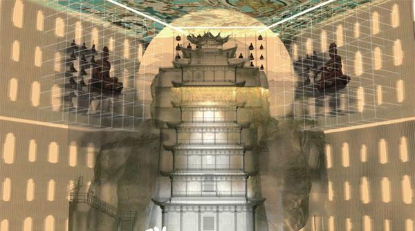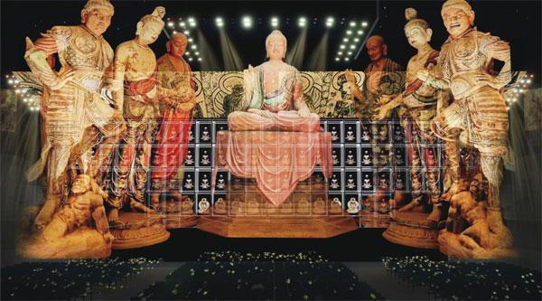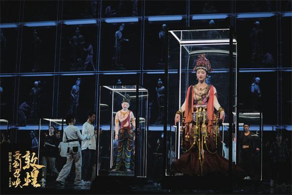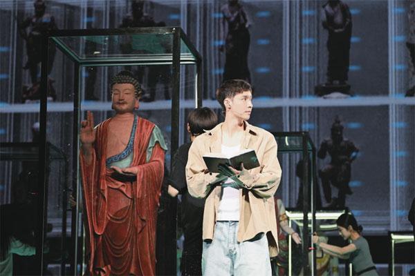 古老的雕塑静静伫立在舞台之上,一群年轻的身影穿梭其间,有条不紊地进行着文物数据采集工作。以舞台为纽带,以音乐诉深情,中国国家话剧院的主创们受到召唤,开启了一场穿越时空的对话——一场与敦煌的心灵交流。