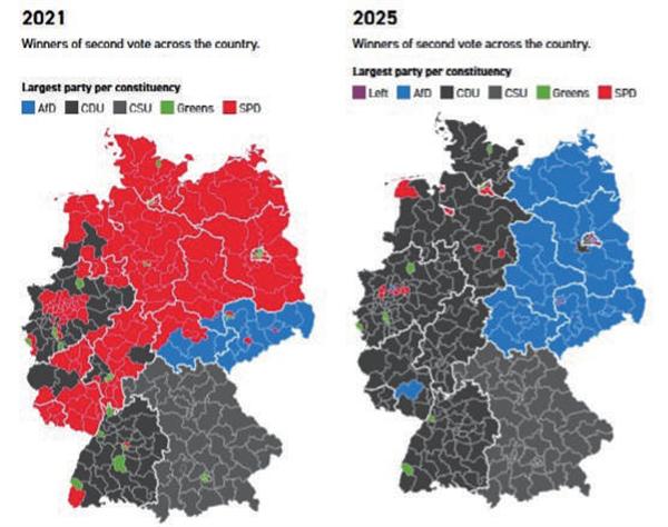 对比2021年到2025年德国联邦议会选举的变化,可以发现今年首次有民粹反建制政党成为第二大党,以至于联盟党和社民党的同盟很难像过去那样被称为“大联合政府”。原东德地区已经被选择党化为一片蓝色“海洋”,与在原西德地区占主导的联盟党分庭抗礼,社民党的地盘则缩成了几个小点。