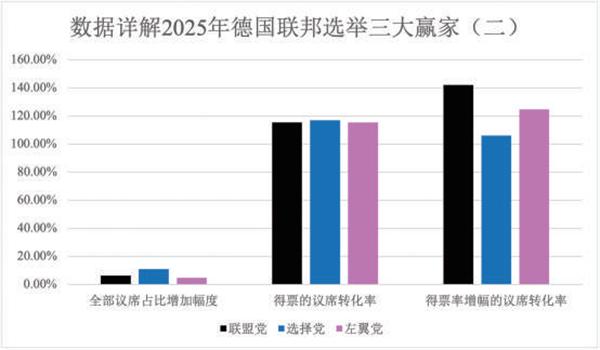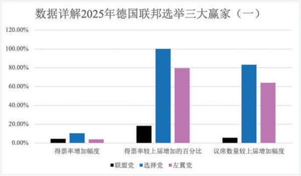 选择党是2025年选举中得票涨幅最大的政党,得票率整整翻了一番,增加的议席数量也是最多的。这个党派超过20%的得票率,意味着每5名德国选民中就有一位投给了选择党。相比之下,另一个赢家联盟党在民调中一度达到30%的支持率,投票后的实际表现却略不及预期;左翼党在选举前两周逆势上扬,从在5%生死线上徘徊的状态一路猛冲,挤掉自民党和莎拉-瓦根克内希特联盟,但仍未达到2017年的成绩。