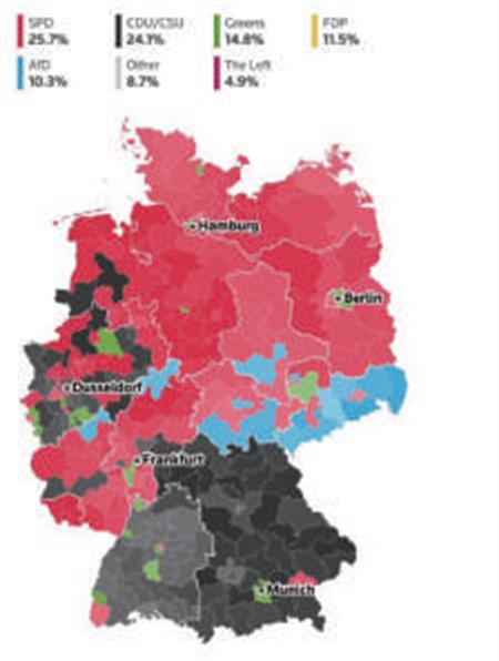 在主流党派为选票明争暗斗的情况下,一旦联盟党和社民党无法达到过半议席,就意味着必须再度组成三党协力的执政联盟。过去4年,奥拉夫·朔尔茨领导“交通灯”政府的教训表明,三党联合执政极度脆弱。幸而有5%门槛的限制,几个小党派此次未能进入议会,一共只有6个政党在联邦议会有存在感;换句话说,基民盟只需要心无旁骛地与社民党谈判组阁,就避免了与被姊妹党领导人排斥的绿党进行合作的尴尬,也不用央求刚刚痛骂了联盟党一顿的左翼党出手相助。