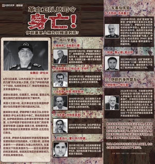 6月13日凌晨,以色列发动大规模空袭,伊朗伊斯兰革命卫队总司令、武装部队总参谋长及多名核物理学家身亡。“国宝”级人物频频遭遇暗杀,伊朗到底怎么了?整理/袁野 制图/程璨