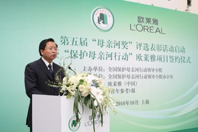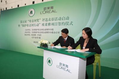 仪式上,全国保护母亲河行动领导小组办公室与欧莱雅(中国)有限公司签署协议,设立总额不少于200万元人民币的“保护母亲河欧莱雅基金”,重点支持全国青少年生态环保社团开展环保活动、建设青少年绿色家园。这是欧莱雅(中国)在连续支持4、5、6届“母亲河奖”评选表彰活动的基础上,再次向保护母亲河行动提供支持,总赞助金额将超过630万元人民币。