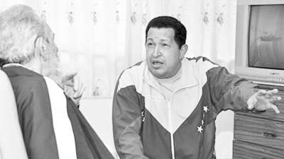 政府官员坚称56岁的查韦斯健康状况不错。查韦斯的兄长表示,查韦斯约2周内就能返回首都加拉加斯。但愤怒的反对派议员表示,查韦斯在国外遥控政府的做法违宪。图为古巴革命领导人菲德尔·卡斯特罗(左)6月17日到古巴一医院探望查韦斯。
