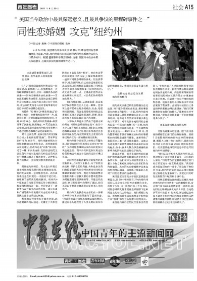 6月24日晚,美国纽约州参议员以33票对29票通过同性恋婚姻合法化法案,至此,纽约州成为目前美国承认同性恋婚姻合法化人口最多的州。美国《基督教科学箴言报》称,这是“美国当今政治中最具深远意义、且最具争议的里程碑事件之一”。