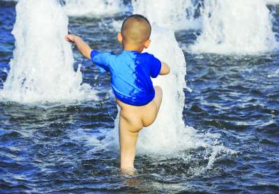 中国西安雁塔广场的喷泉成了孩子们的水上乐园 |