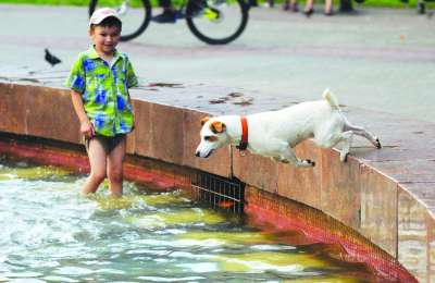 莫斯科的孩子和宠物一起享受水中的乐趣 |