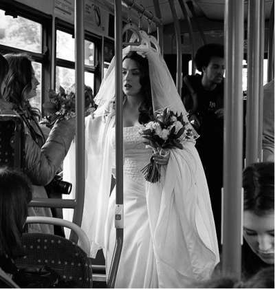 但车上人们的反应却让珍妮有些意外,本以为大家都会对她投来惊奇的目光,并围上了问长问短,谁知大多数乘客都无动于衷,甚至连给她让个座的表示都没有。无奈之下,这位美丽的新娘只好手捧鲜花,在两位伴娘的陪伴下,一路站到了终点。