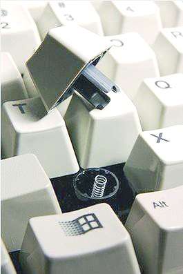 D 70年代末:向Selectric致敬 由于Selectric打字机用户群庞大,相当一部分人还是习惯于它的键盘。1978年IBM获得了一种被称作“扣住弹簧”的专利,即让电脑键盘拥有Selectric打字机键盘那样的体验,甚至连敲击的声音都相差不大。这项专利原理说起来也简单,就是在原有的非水平键帽下面加一个小弹簧。利用这项专利的键盘一经推出,即刻便大受欢迎。 |